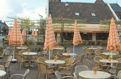 Het bestaande terras, naast en voor het pand, is uitgebreid met een groot terras op het tegenovergelegen marktplein.